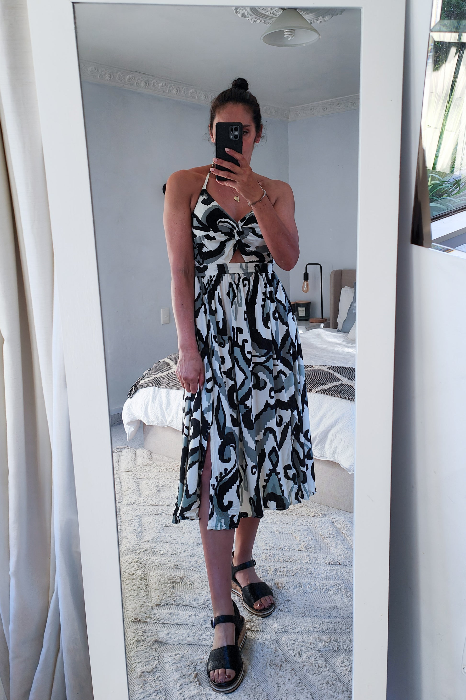 Get summer-ready with this playful halter tie dress in sage and black! Its flattering halter neckline highlights your shoulders, while the unique twist front under bust adds a fun, flirty twist. Perfect for sunny days and balmy nights, this dress combines comfort and style effortlessly. Whether you're off to a beach party or a casual brunch, this lightweight piece will keep you cool and looking effortlessly chic.