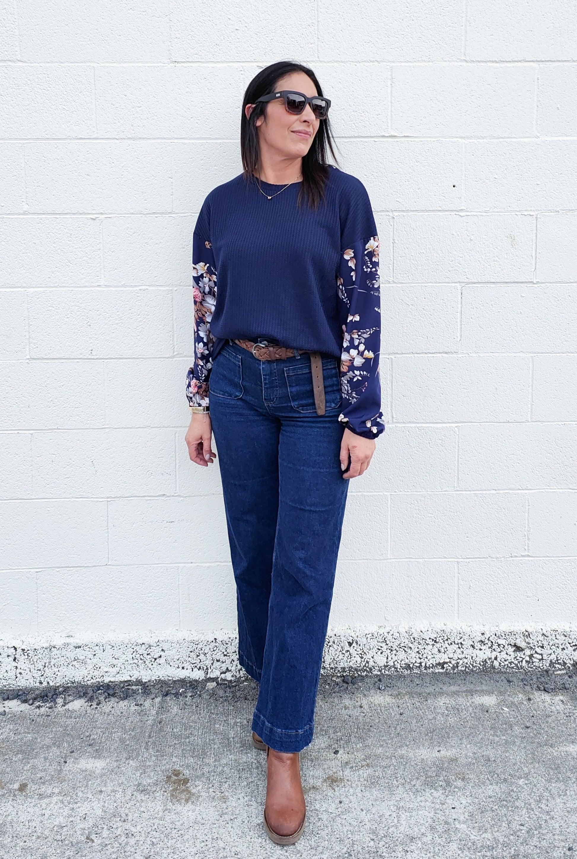 PRE-ORDER** Navy Silky Floral Sleeve Amie Top
