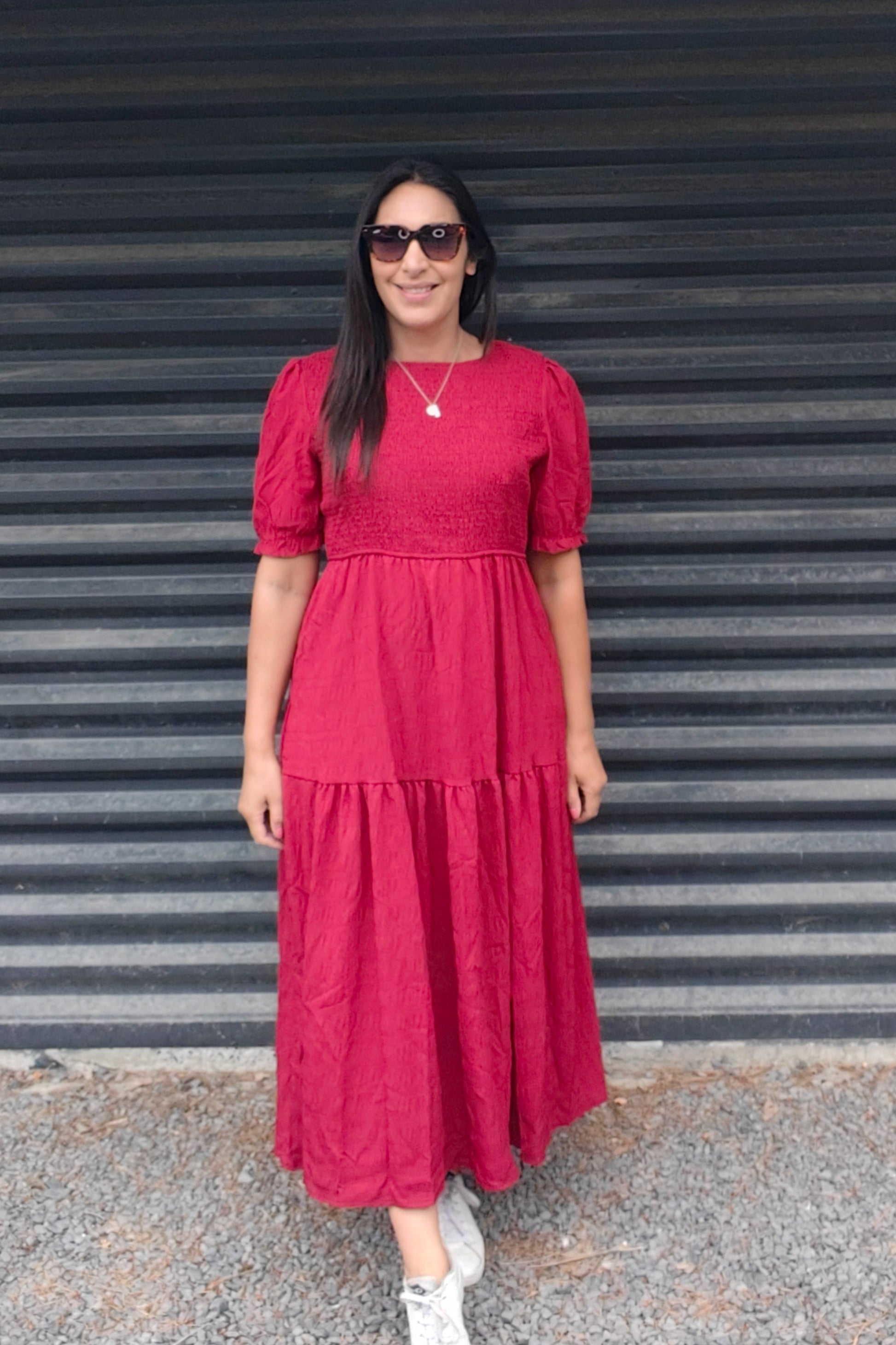 PRE-ORDER** Raspberry - Textured Short Sleeve Shirred Josephine Dress