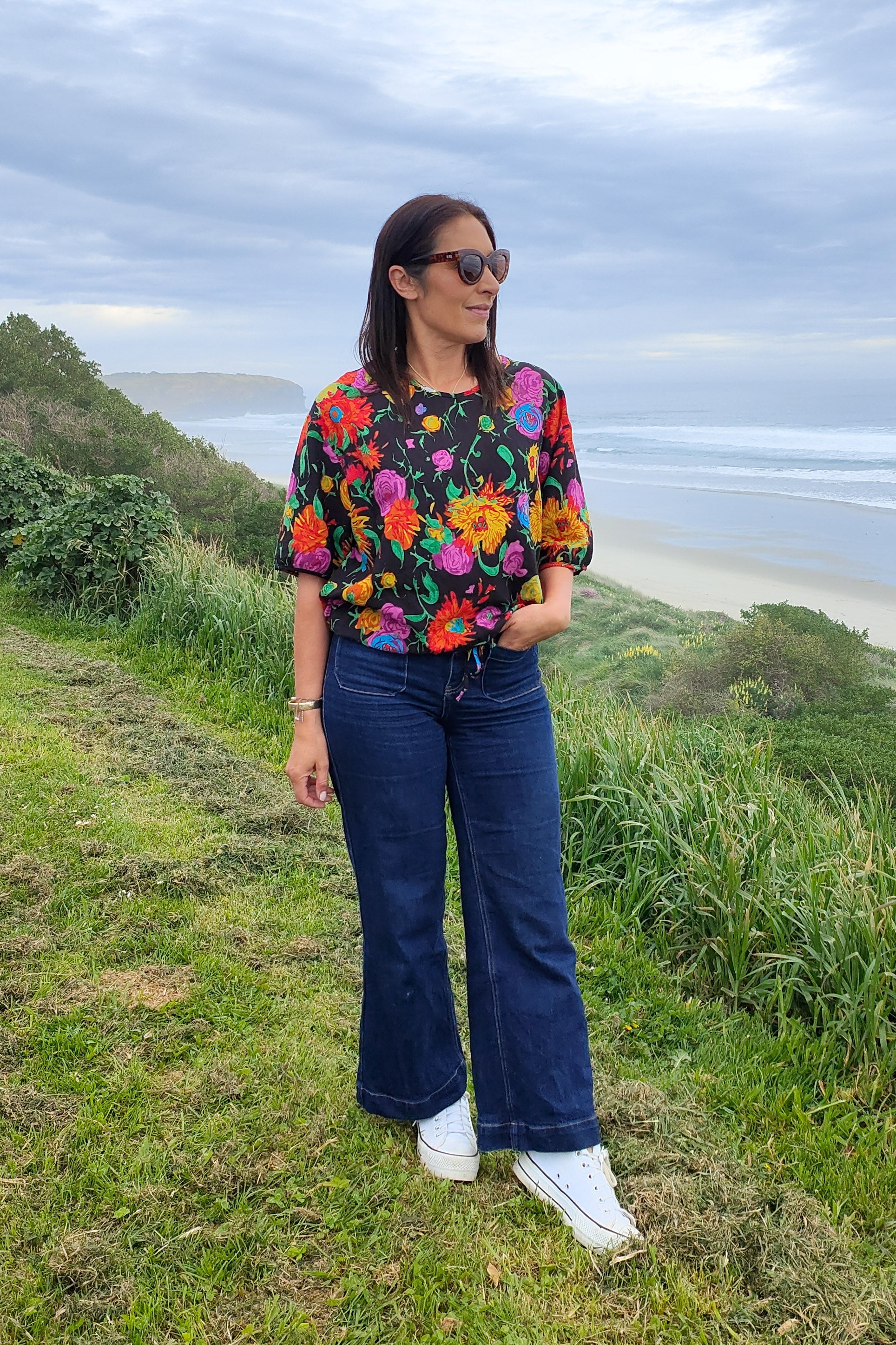A comfy cotton blend top that's a little different and will be great teamed with denim. Tie at bottom means you can wear looser or tighter.