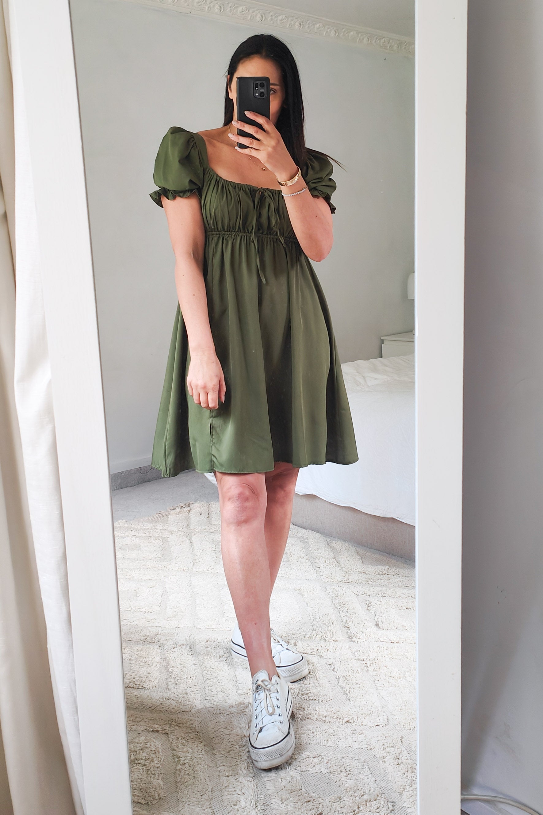 The Shorter Silky Trinity Dress in Olive features elegant short puff sleeves and a gathered empire line bust for a flattering fit. It's stylish midi length and small split add a touch of drama, perfect for any special occasion or evening out. Experience effortless sophistication and comfort in this standout dress.