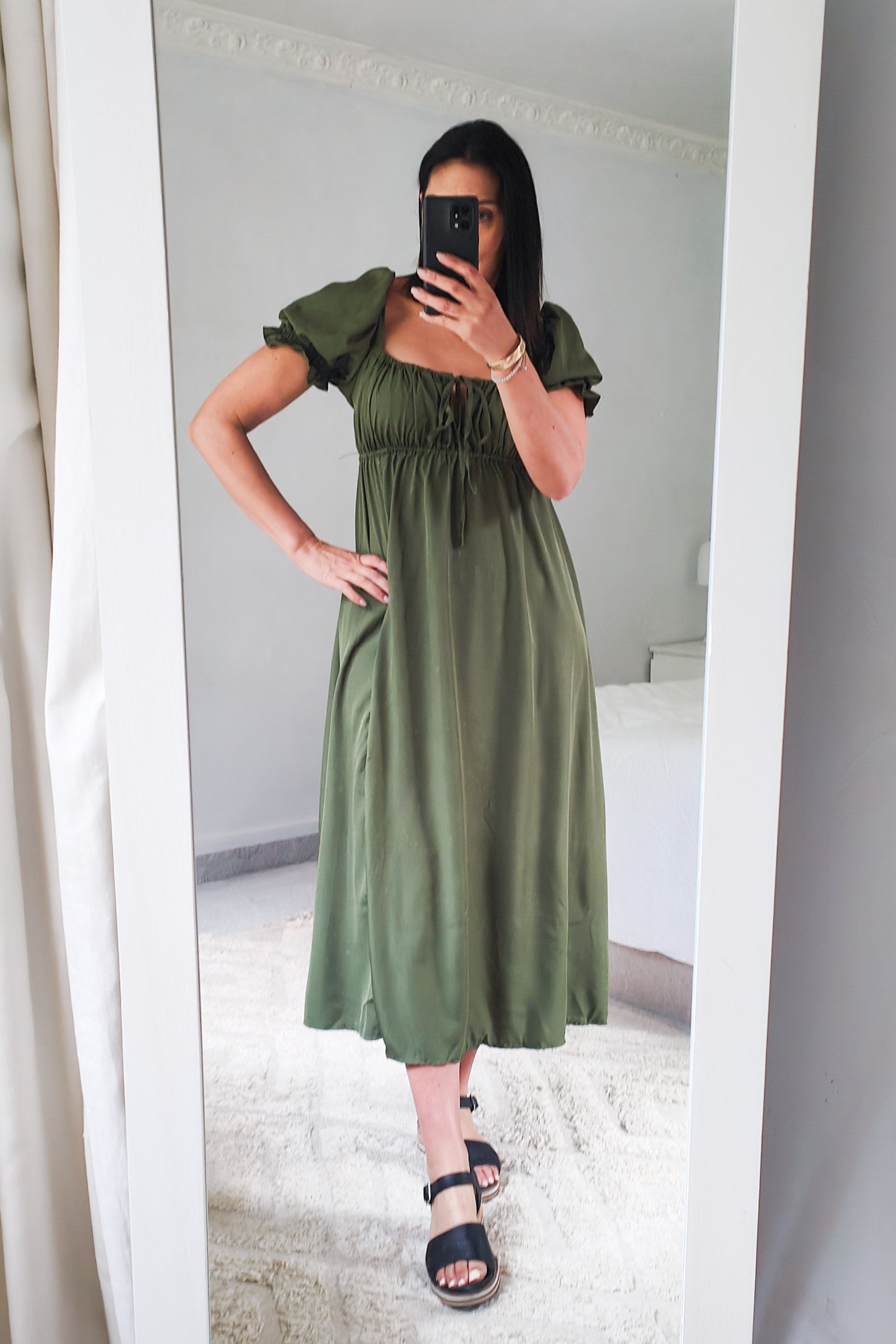 The Silky Trinity Maxi Dress in Olive features elegant short puff sleeves and a gathered empire line bust for a flattering fit. Its flowing maxi length and stylish split add a touch of drama, perfect for any special occasion or evening out. Experience effortless sophistication and comfort in this standout dress.
