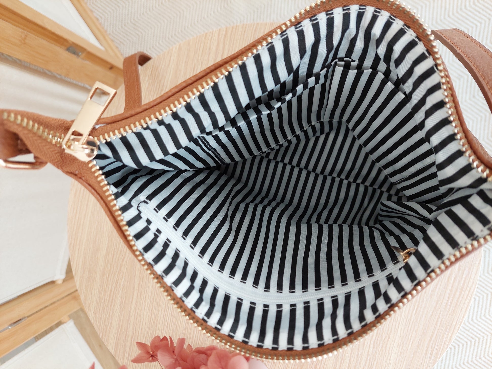 Details: Zipped interior pocket, playful fabric lining and comes with a shoulder strap.